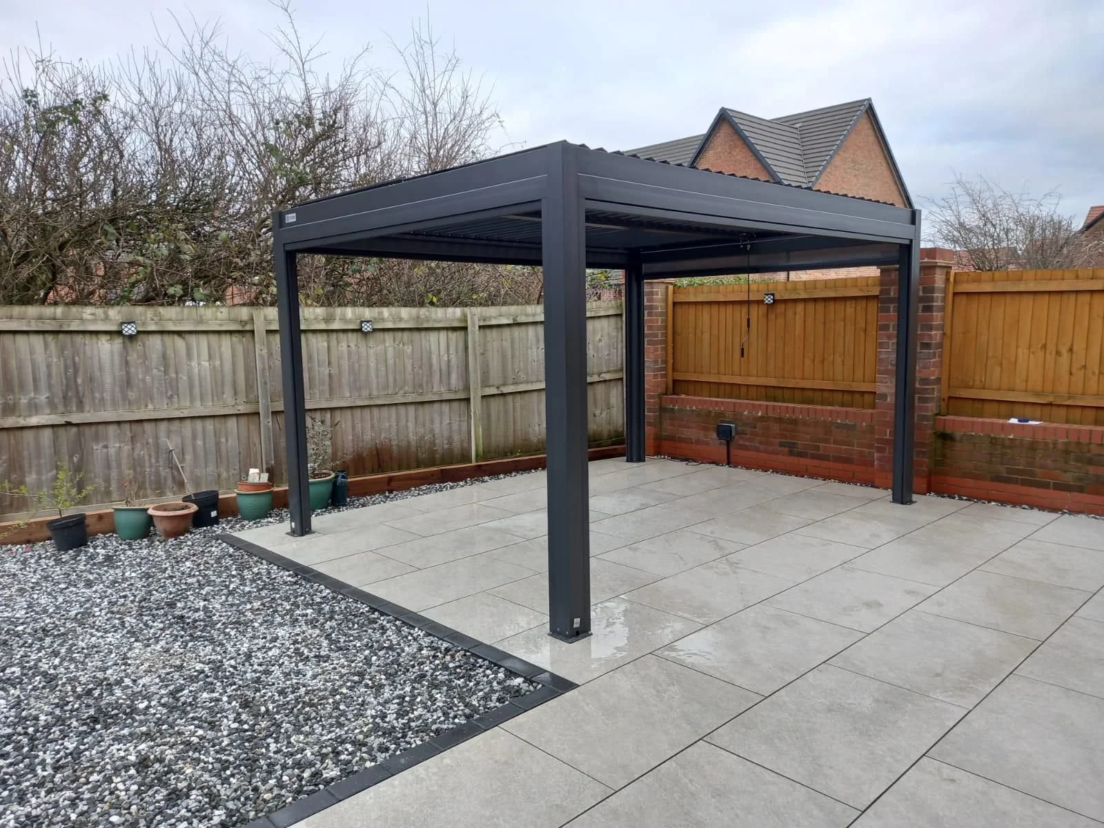 At the rear, a sleek pergola creates a dedicated seating area, while horizontal slatted fencing enhances privacy and ties the design together. The result is a low-maintenance, balanced garden built for both relaxing and entertaining.
